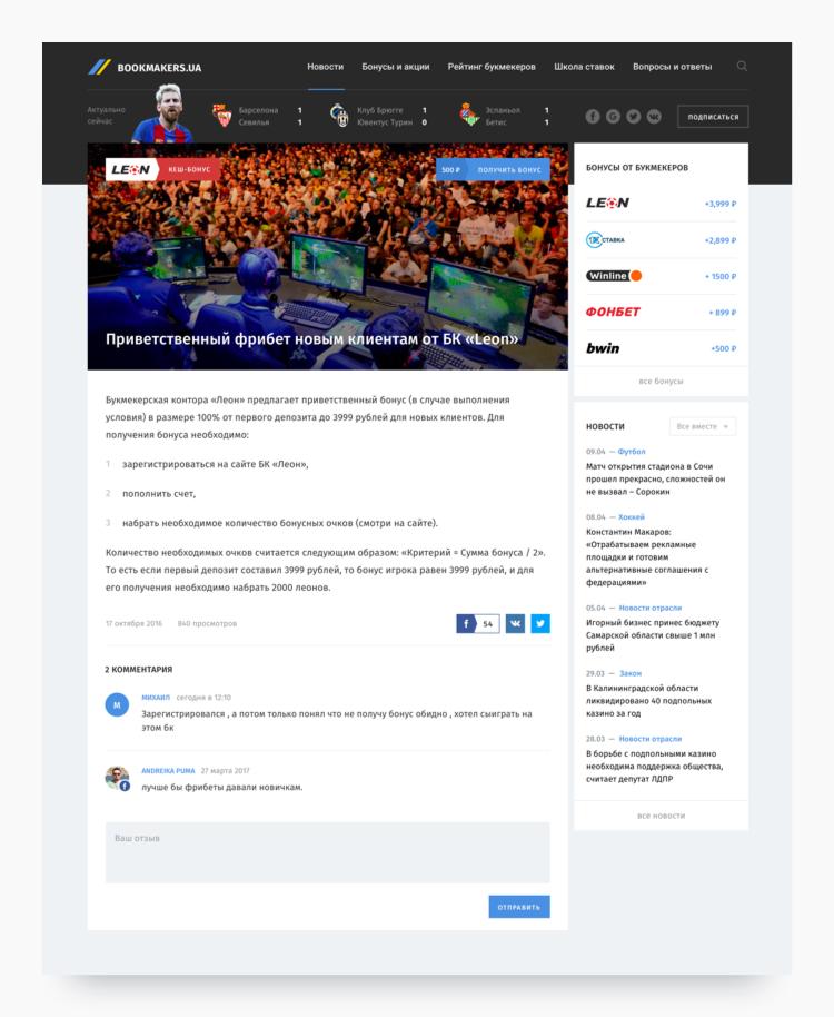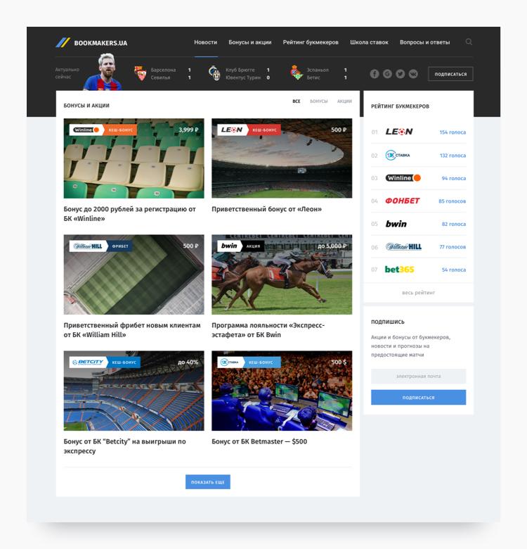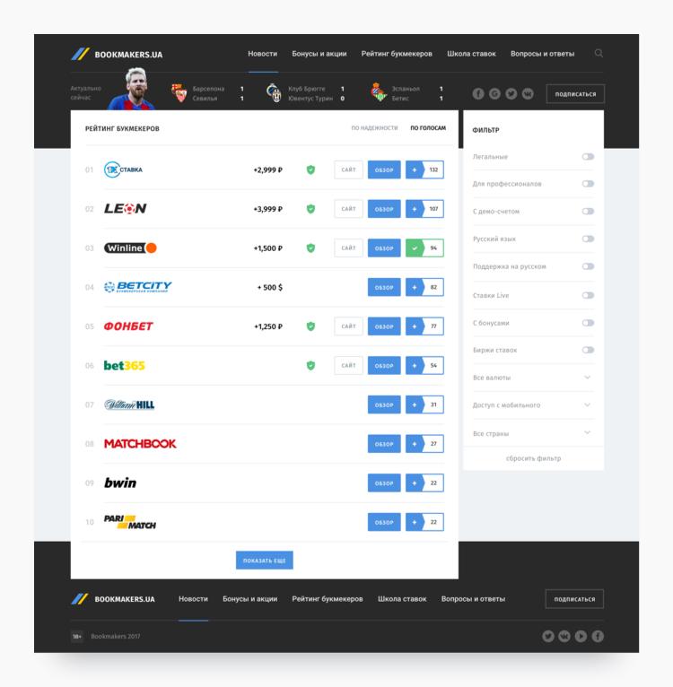 Bookmakers.ua is a Ukrainian sports betting website that allows players to make smarter bets by tracking the best offers and prizes from several bookmakers with regular updates of sports news.
