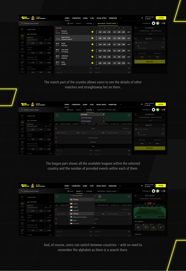 It is essential not to break classic user flow and at the same to offer a bit more than other competitors do. In this design, several small but gold features are added – events selection, payout as an input and quick bets.