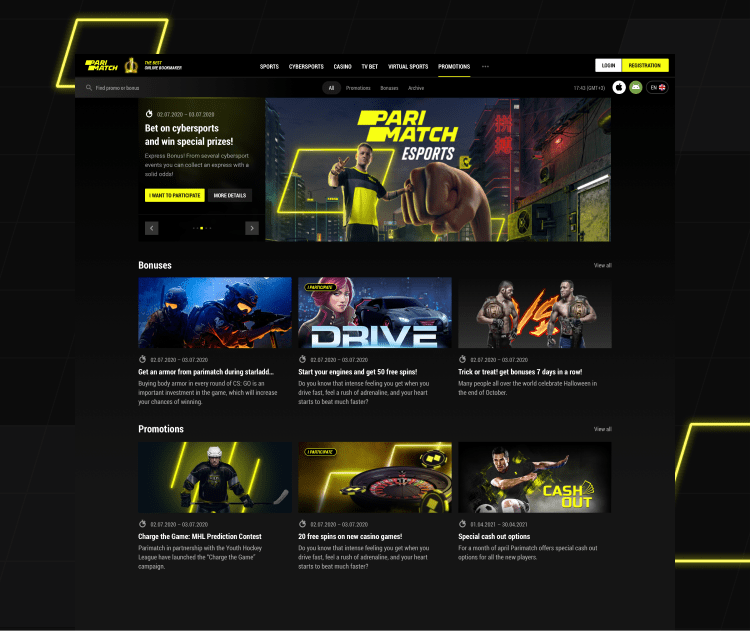 What about all those great promotions? Our idea is to highlight those opportunities Parimatch offers to its users, not hide them. That’s why, firstly, the promo has its own dedicated space – beautiful and easy to navigate, secondly, the link goes in the main header menu.