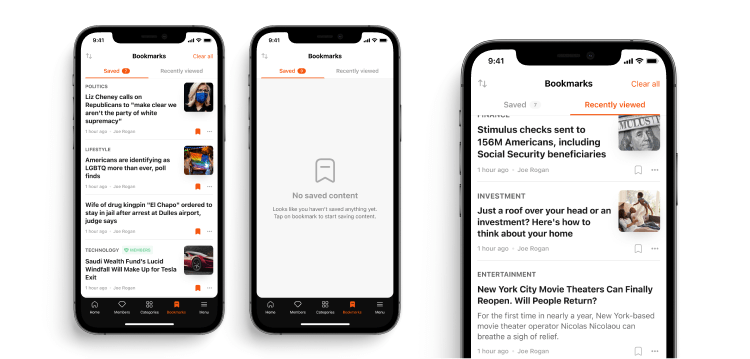 Having a million distractions every second, it’s easy to forget about an article even if it’s crucial or intriguing. Bookmarks and recents make the user experience much better and improve the retention rate a lot.