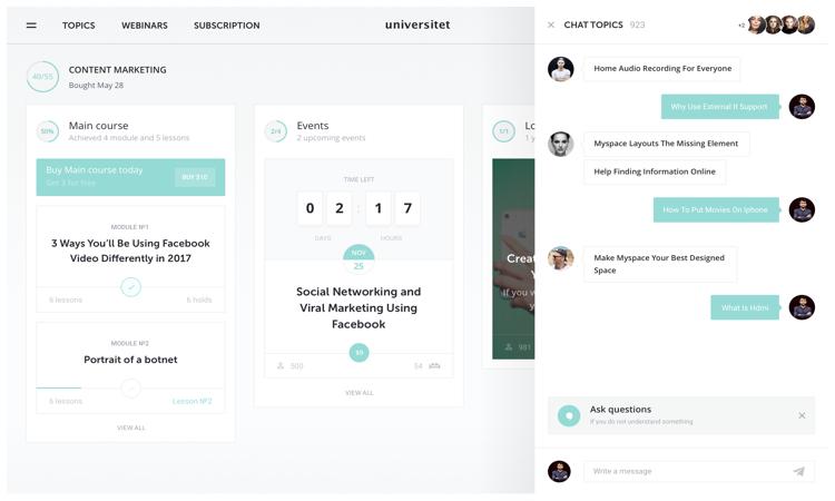 To help Universitet users interact freely with one another while learning, we created internal chat rooms. Now they have the opportunity to discuss a course, or a particular lesson – it helps them study together and exchange acquired knowledge.