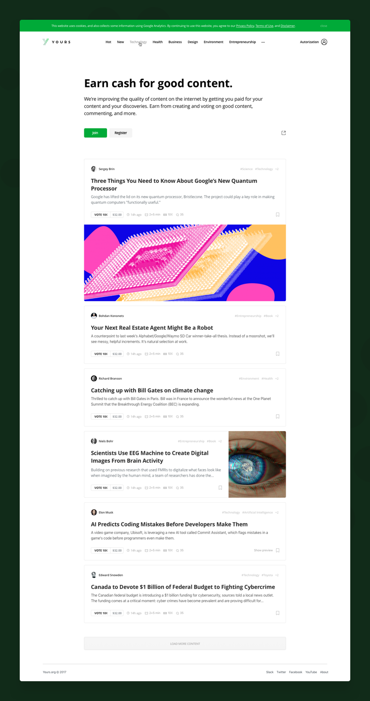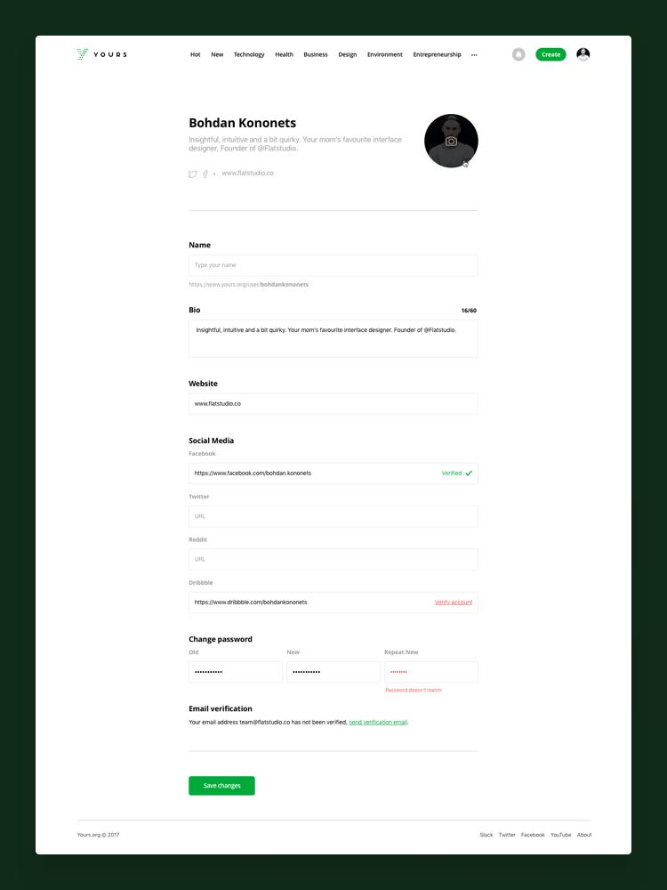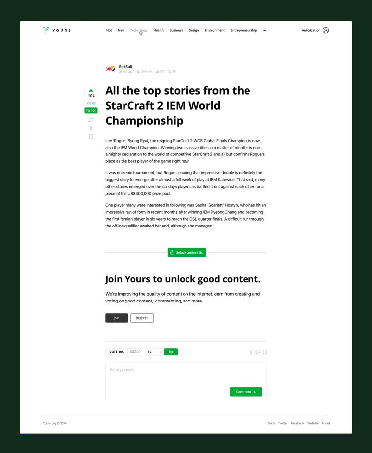Sleek and easily navigable interface. The Yours’ homepage is so well designed and structured everything is essentially a click away. From preview of other articles to well laid out communities, you couldn't be more assured of an amazing reading experience.