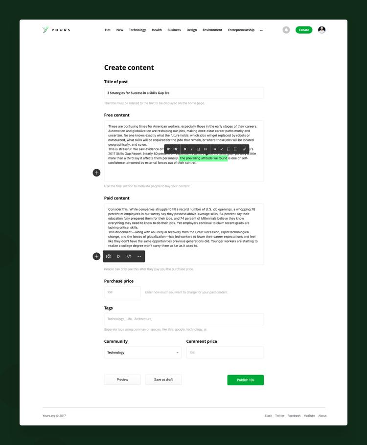 Creating content on-the-go. Yours allows you to publish your content and set the rules for each post. From your preferred community tags to the purchase price, if you authored it, then everything is all Yours to determine.