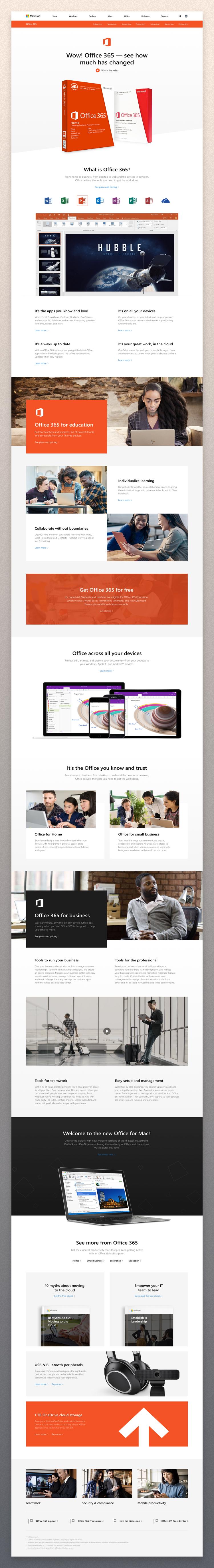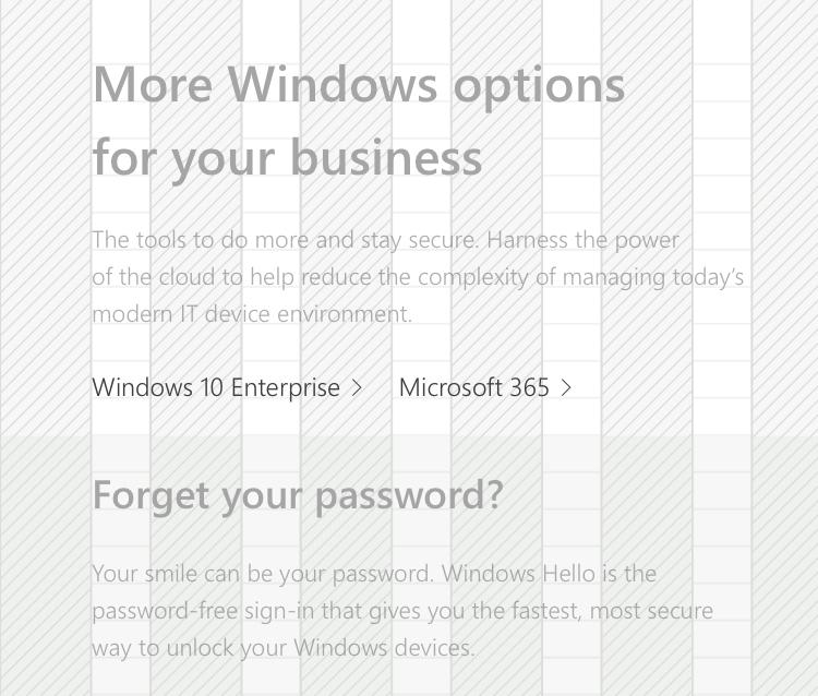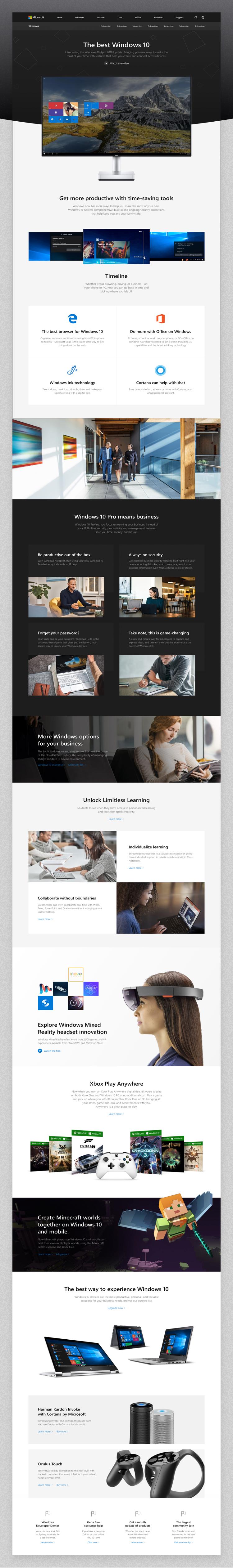 Windows 10 page deserved a special look which would accentuate its universal style as now this is the main OS for its whole range of Microsoft devices. The two color schemes landing shows the main features for both personal and business users.