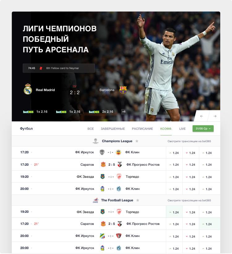 We designed the sports main page to feature an array of details on sorted events: completed matches, upcoming matches, leagues catalogue and coefficients from the leading bookmakers in the industry. In the development of the main page, it was essential to take into account all possible sports grids, for example, eSports, tennis and MMA contain different grids but perfectly fit together as they play by the same rules.