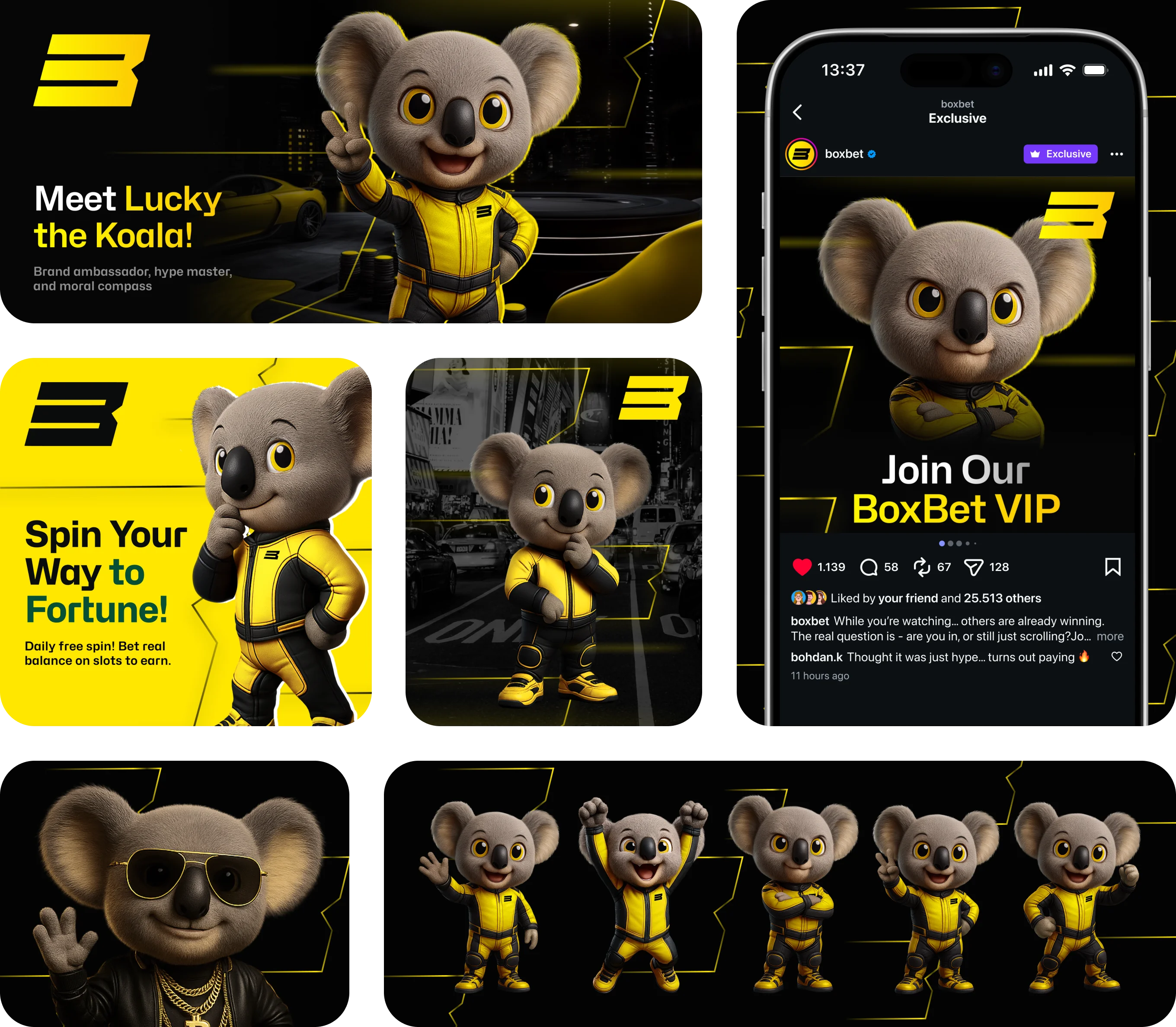 A custom identity with a specific Pantone code and a logo built on a systemic tilt angle. A mascot people recognize (I'm confident you'll be associating a koala with BoxBet for a while 😄) — one that serves a function in every section of the product. Promo mechanics built in a unified visual language regardless of the channel. A design system that makes the Telegram app and the website feel like the same product in different containers.