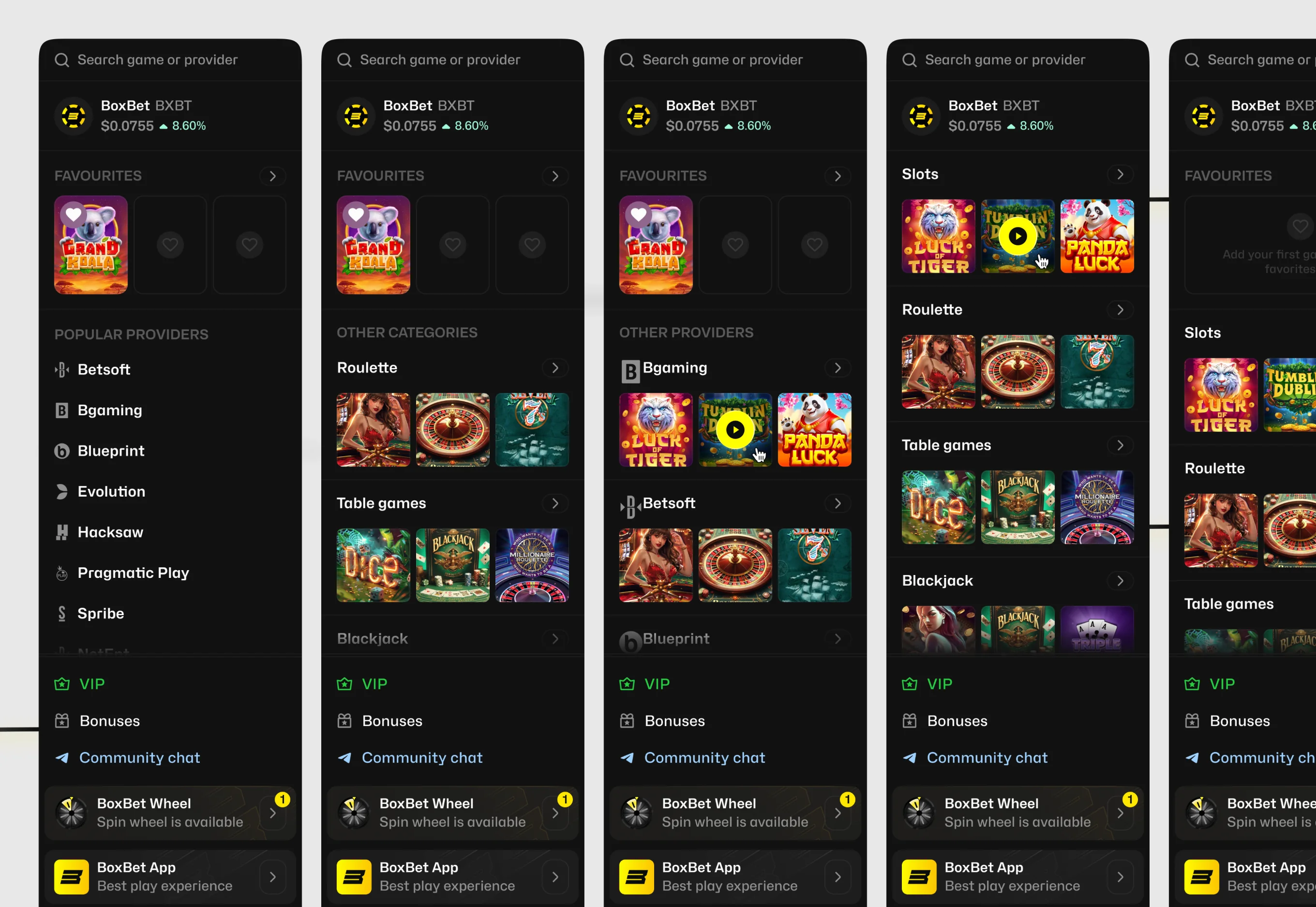 - Game card micro-interactions — hover behavior for game cards in the casino. The detail that separates a live interface from static markup.