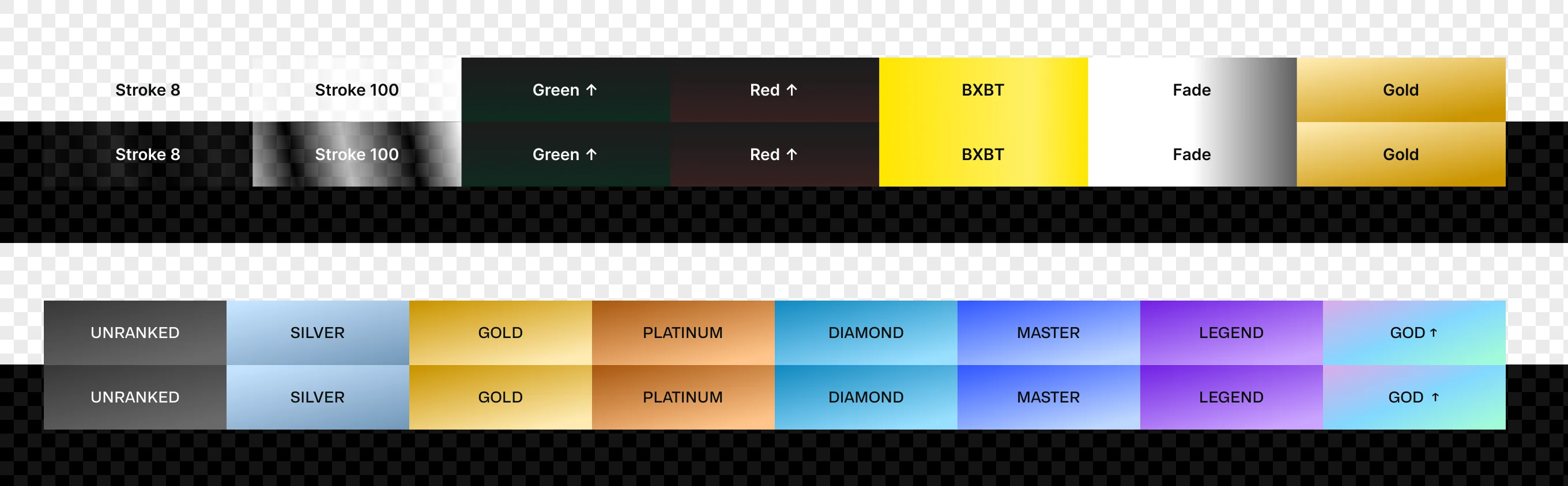 - Colors. Brand (Primary, Brand Gradient, Secondary, Tertiary Dark), Background from 0 to 30, Grey from 90 to 0, Transparent (White 0.6, Overlay, Ghost), Red, Green, Gradients (Stroke, BXBT, Fade, Gold), Shadows. A separate block — VIP Colors: Unranked, Silver, Gold, Platinum, Diamond, Master, Legend, God+. Eight colors, each tied to a VIP program level and the corresponding Lucky variant.