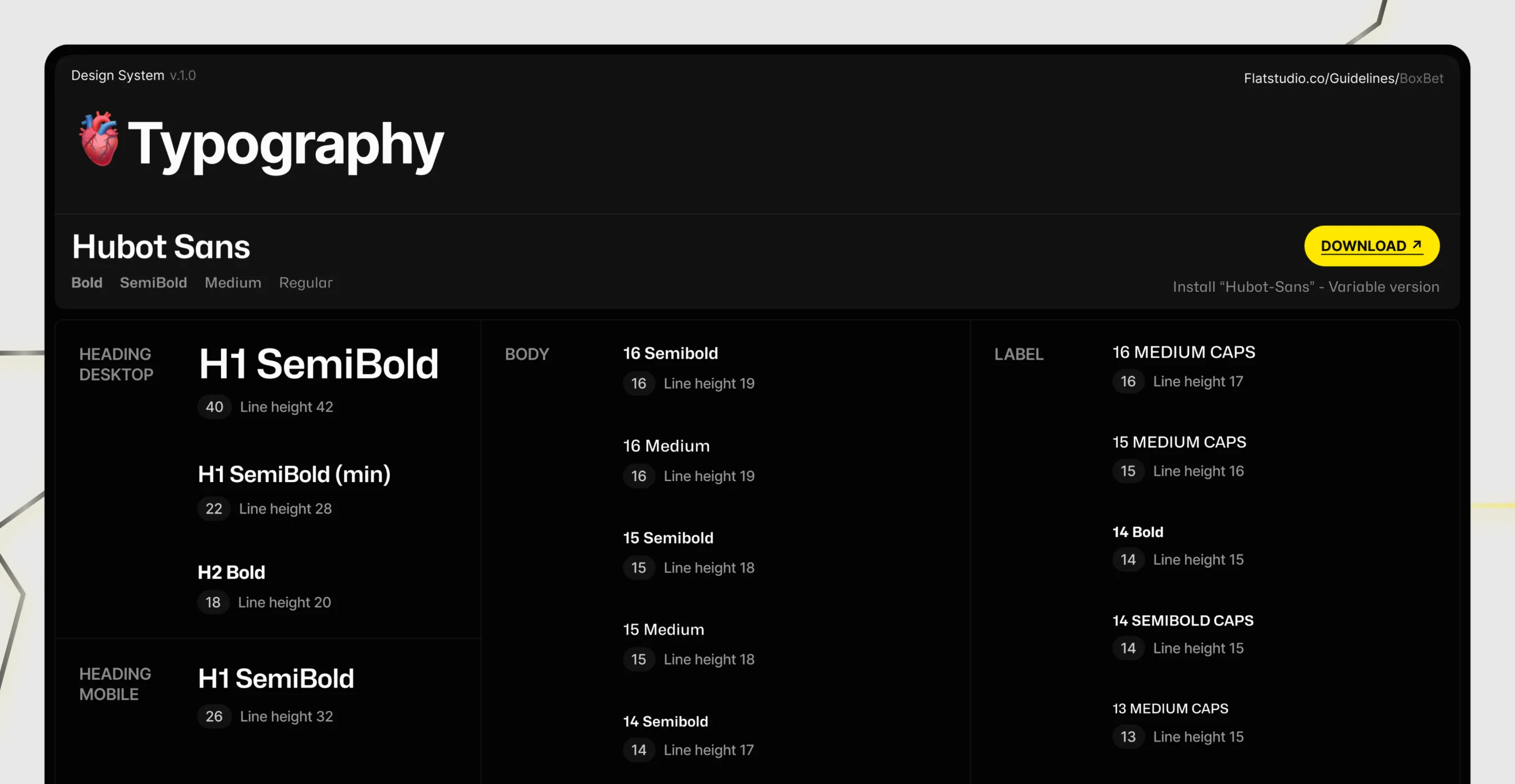 - Typography. Hubot Sans in four roles: Heading (Desktop and Mobile), Body, Label, Caption. Heading Desktop starts at H1 SemiBold 40/42 and steps down to H2 Bold 18/20. Label has separate lowercase and caps styles stepping from 16 to 12. Caption — two variants for long-form text: 14/20 and 12/15. A complete scale with no gaps.