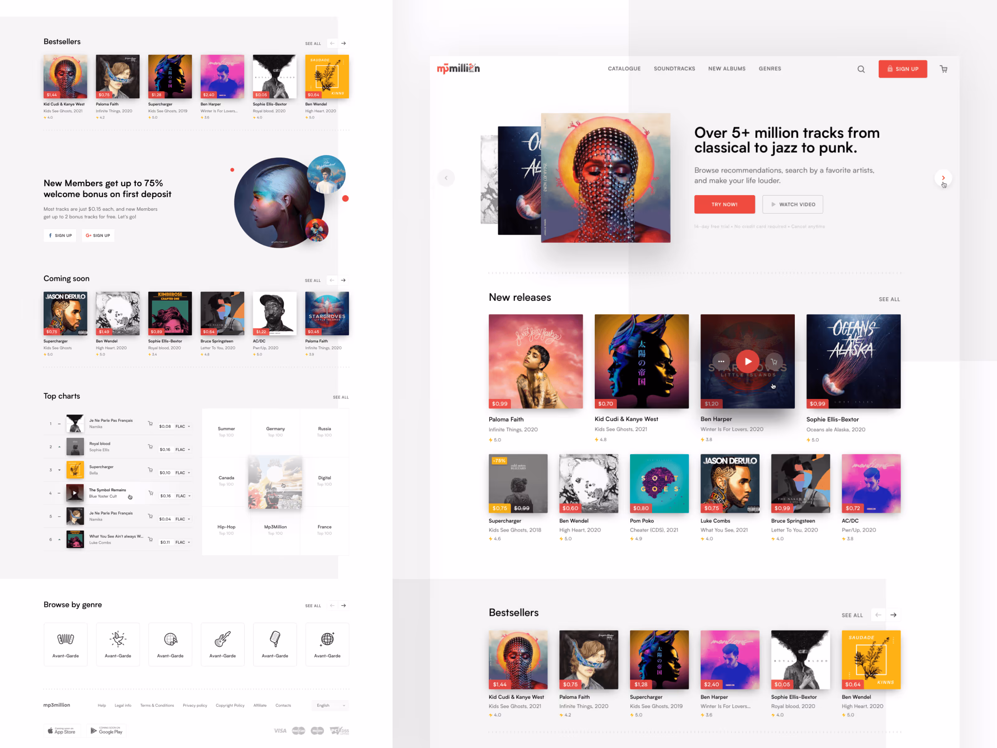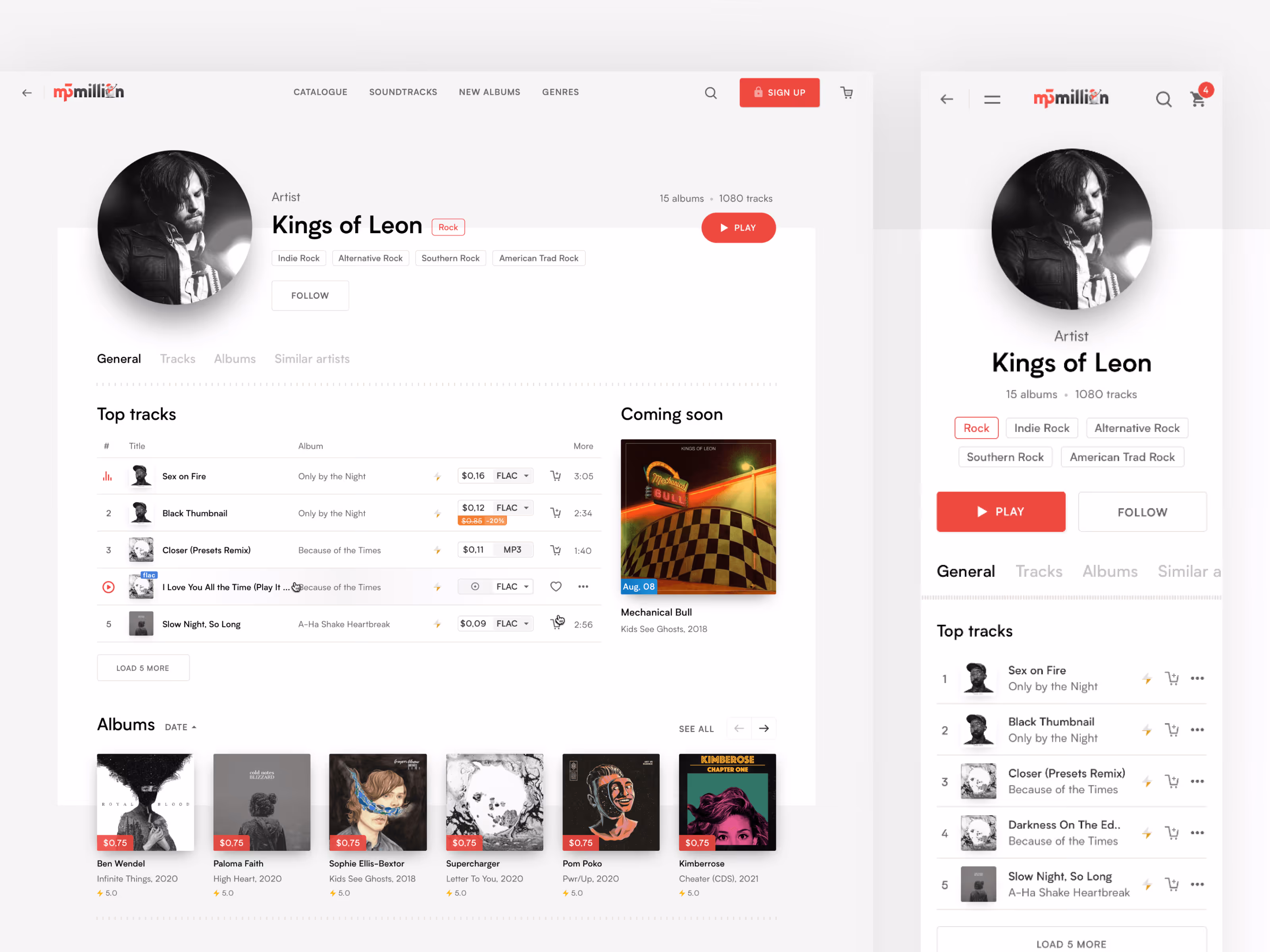 This was the trickiest balance. Streaming services focus on "vibe" (dark backgrounds, moody full-screen imagery), but Mp3million is a store. Here, the user is making a purchase decision.