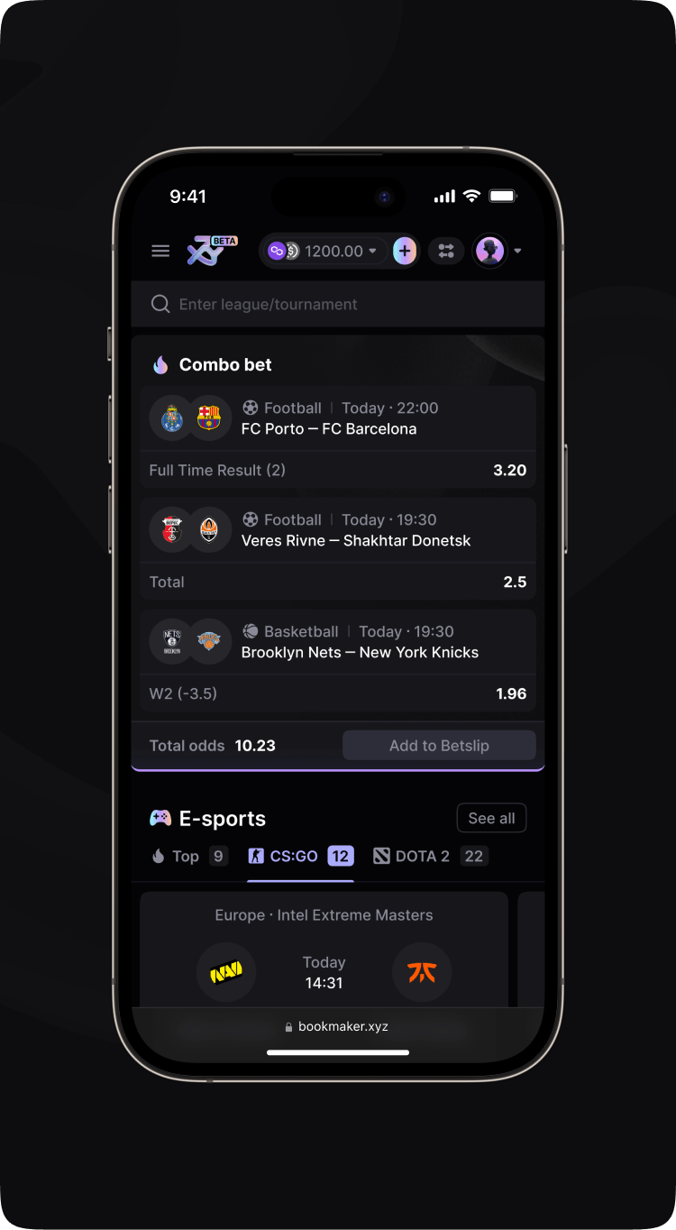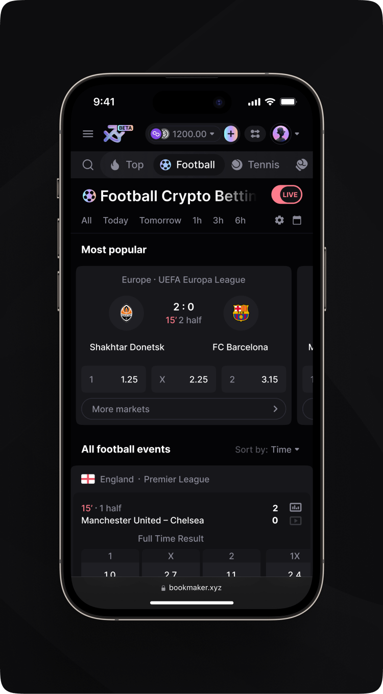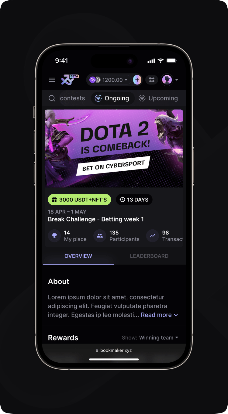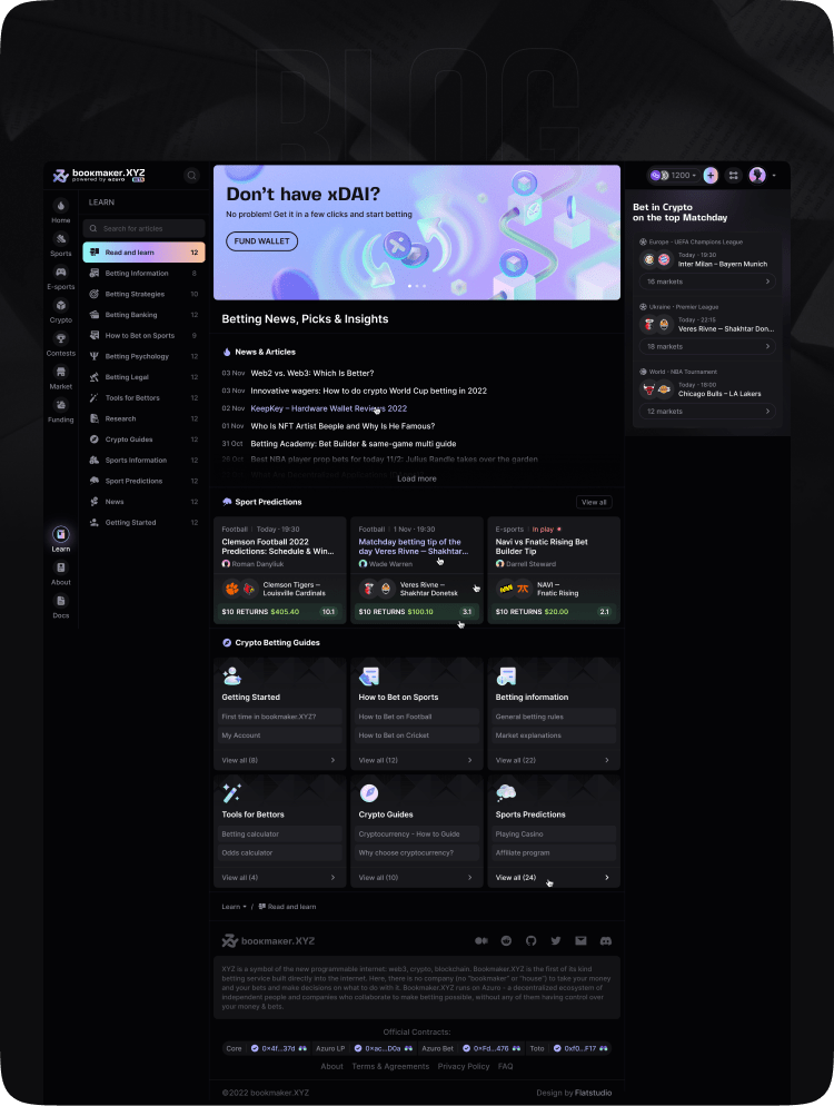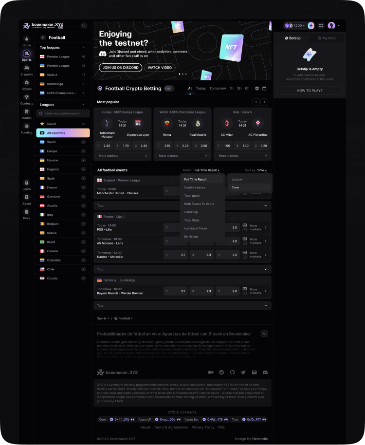 Bookmaker.XYZ isn't a typical bookmaker. You can bet and win here, but there's no house or sportsbook betting against you. The funds are distributed by Azuro protocol, being held in blockchain contracts.