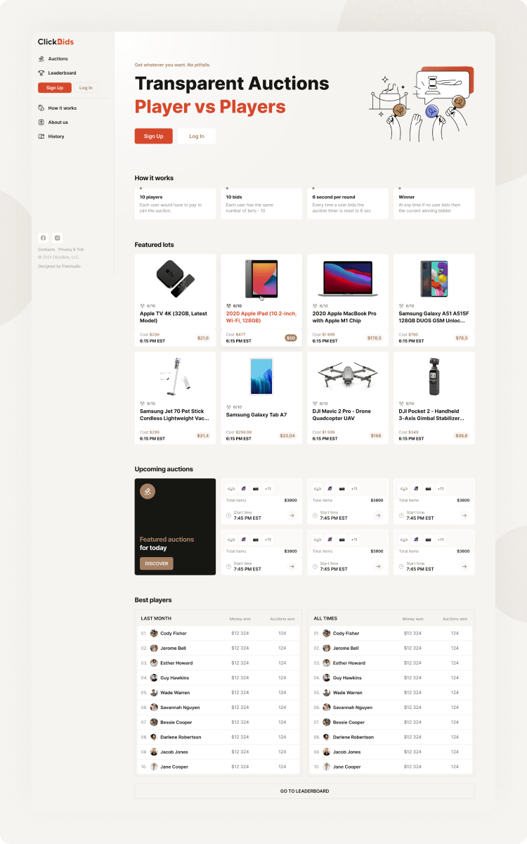 ClickBids is serious about safety and establishing players' trust. To show the authenticity and credibility of the brand we designed the home page to be subtle and informative with a punch of fun.