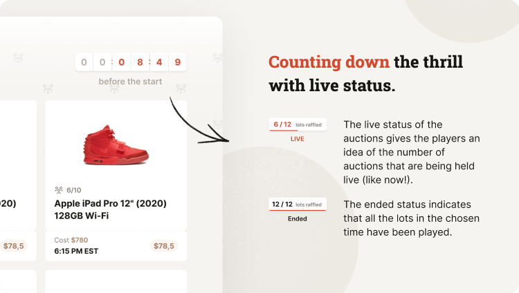 We designed the open auction to be flexible so that a player can choose to take part in a game at their well suited time. Furthermore, they can also cherry-pick a lot based on parameters like entry cost and number of players that have already joined.