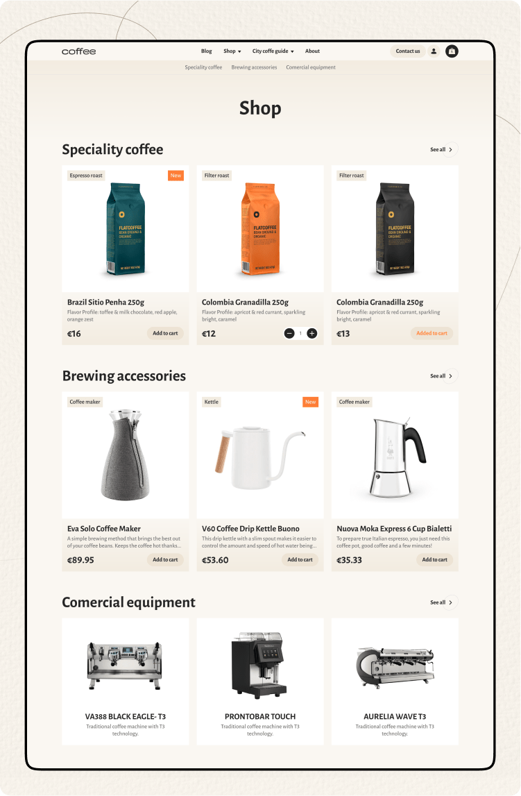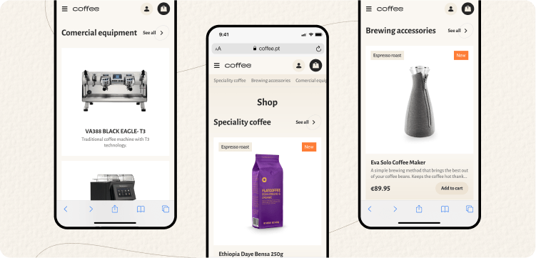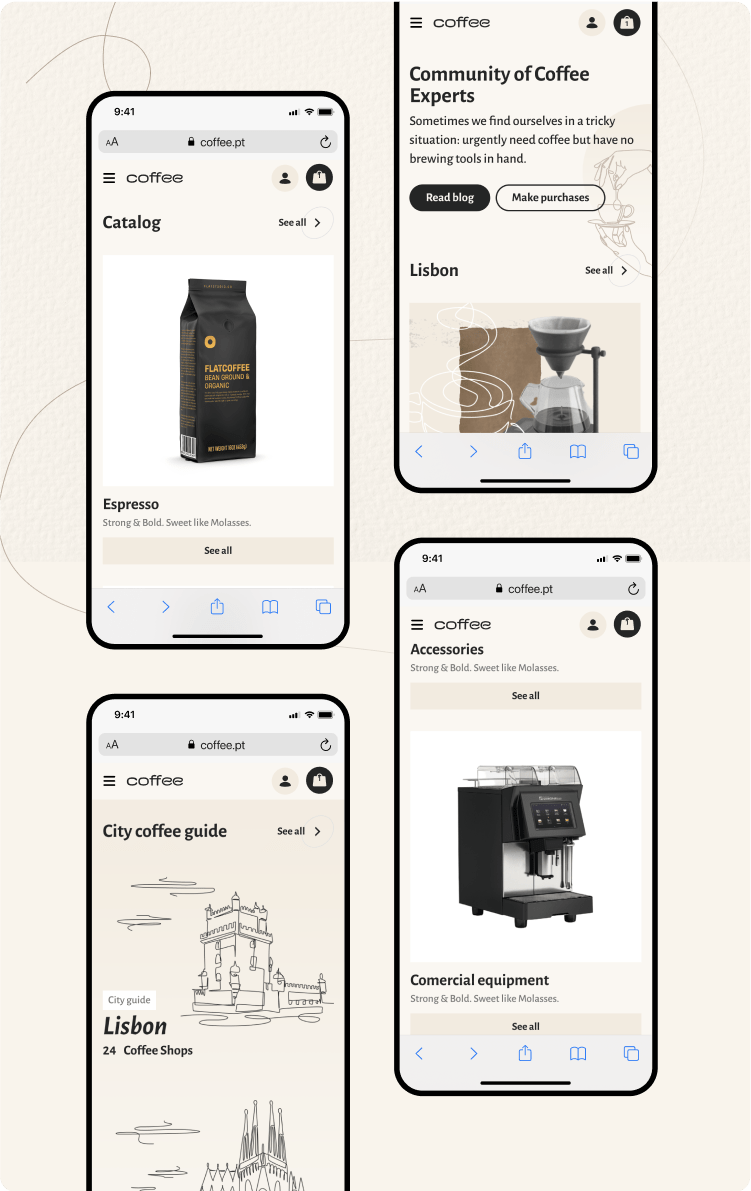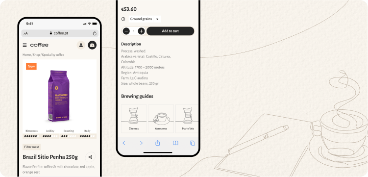 After having read and understood about coffee and specialty coffee, the users will want to stock their jars with delicious and aromatic coffee. That’s when they navigate to coffee.pt shop. We designed the shop to display the items methodically and enhance the shopping experience.