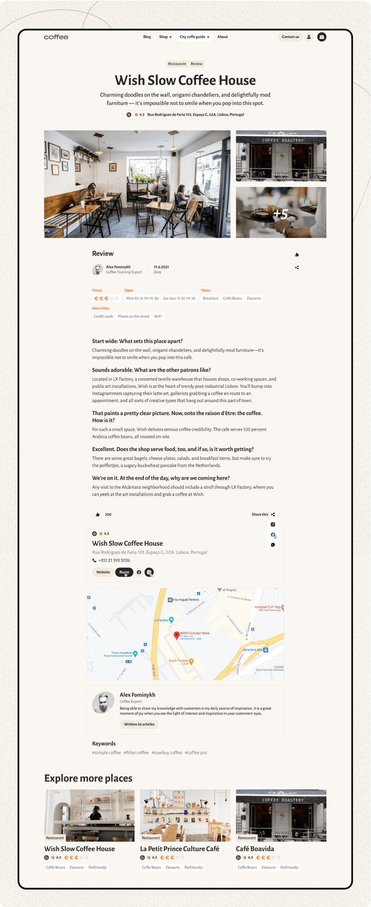 For all those constantly seeking new experiences (and endlessly scouting google), we have put together a collection of city guides. The page is designed in a way that subtly grabs attention and helps the users find places that would perfectly compliment their cup of coffee .