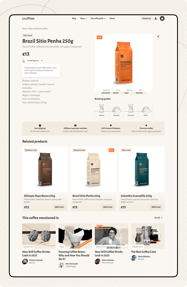 Coffee.pt is not just another ecom store. It not only brings the best-in-class coffee to the users but also educates them by sharing valuable information about coffee. We designed the page to show all the necessary details a user needs to know before taking their credit cards out.