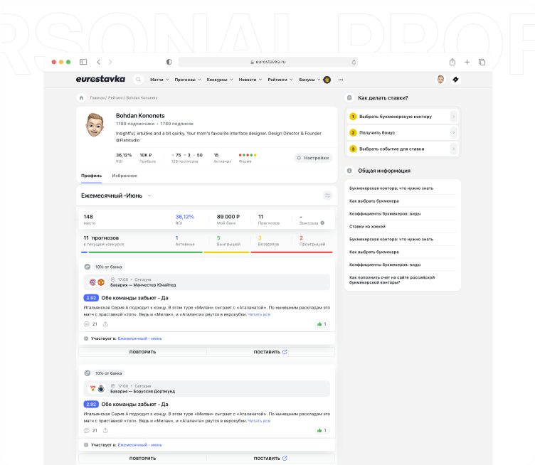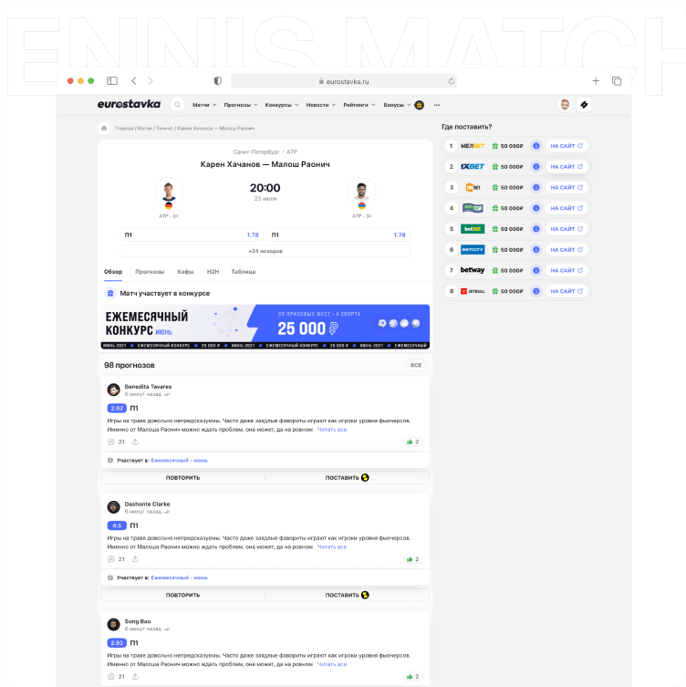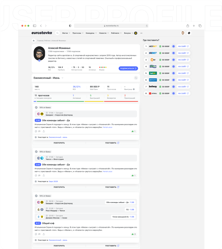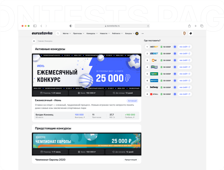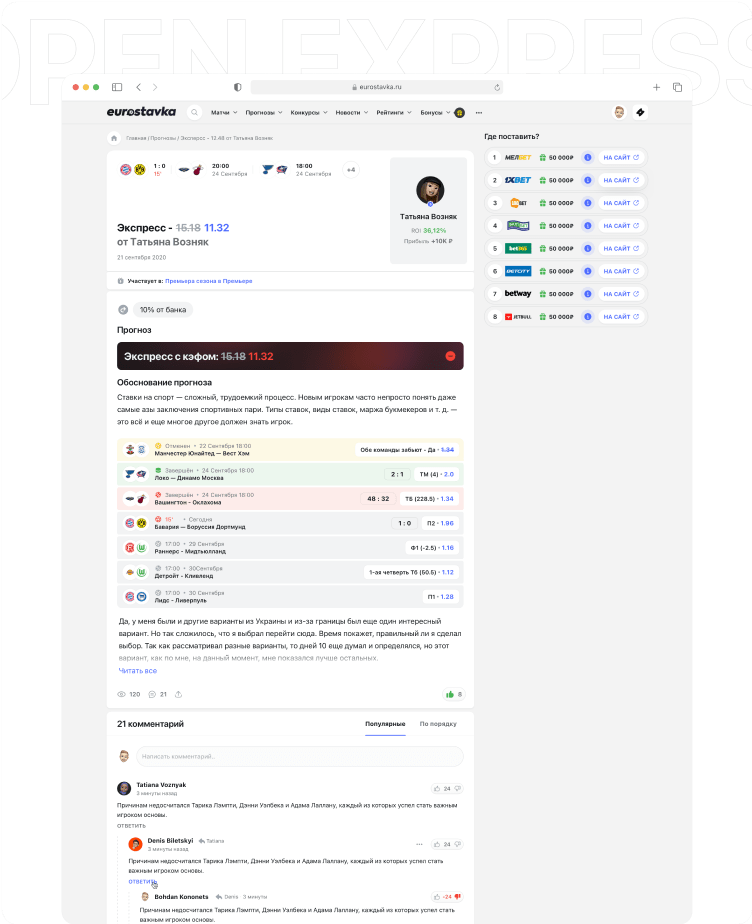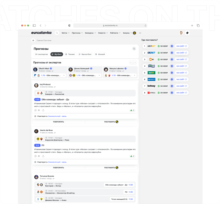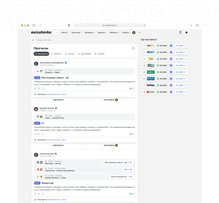 Eurostavka is an ambitious young project that has all the chances to shake up the well-defined betting-related resources market, bringing the parlay forecasts and reimagining all competitors' best features into something new.