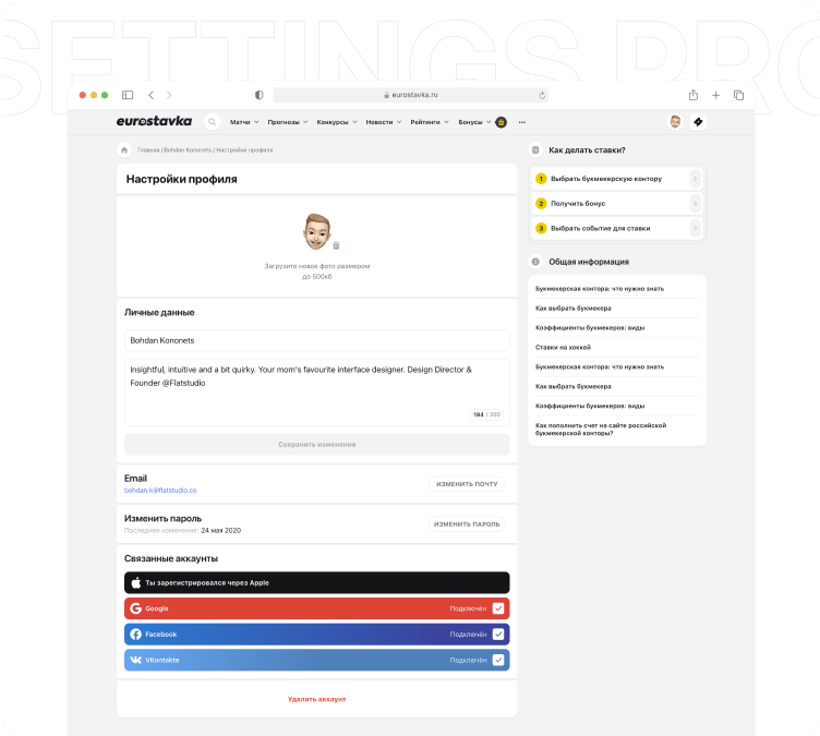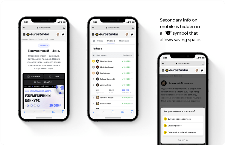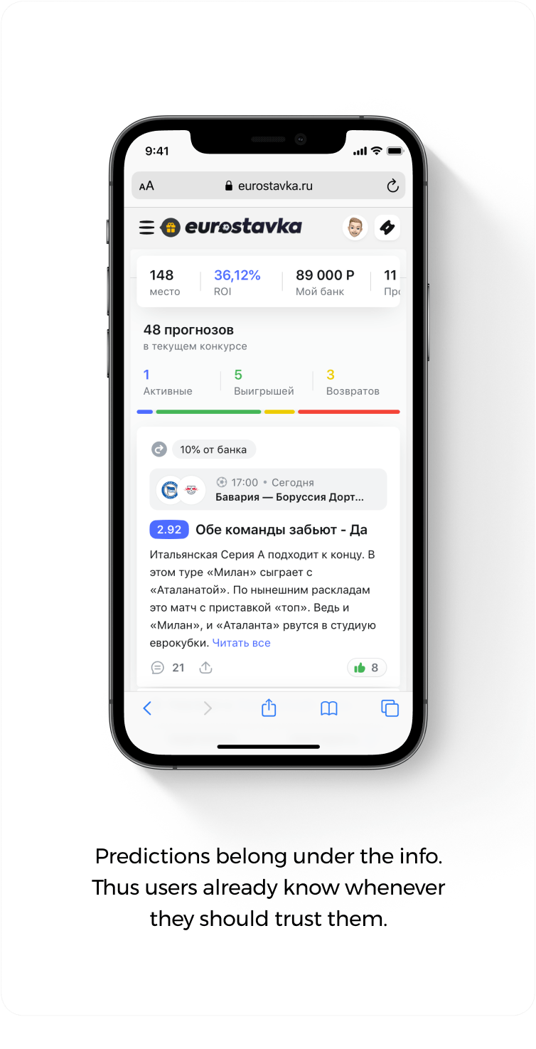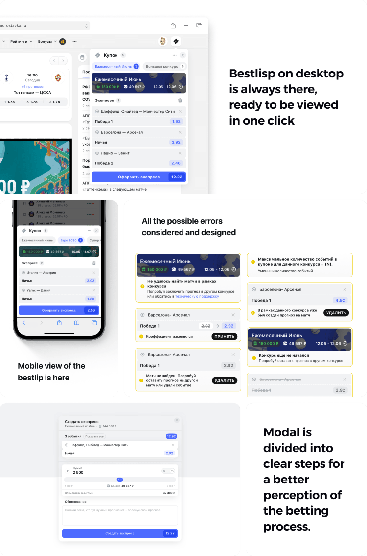 Eurostavka imitates the actual betting process as a playground and offers the possibility to bet quickly and easily while smoothly educating users and giving opportunities to try different approaches.
