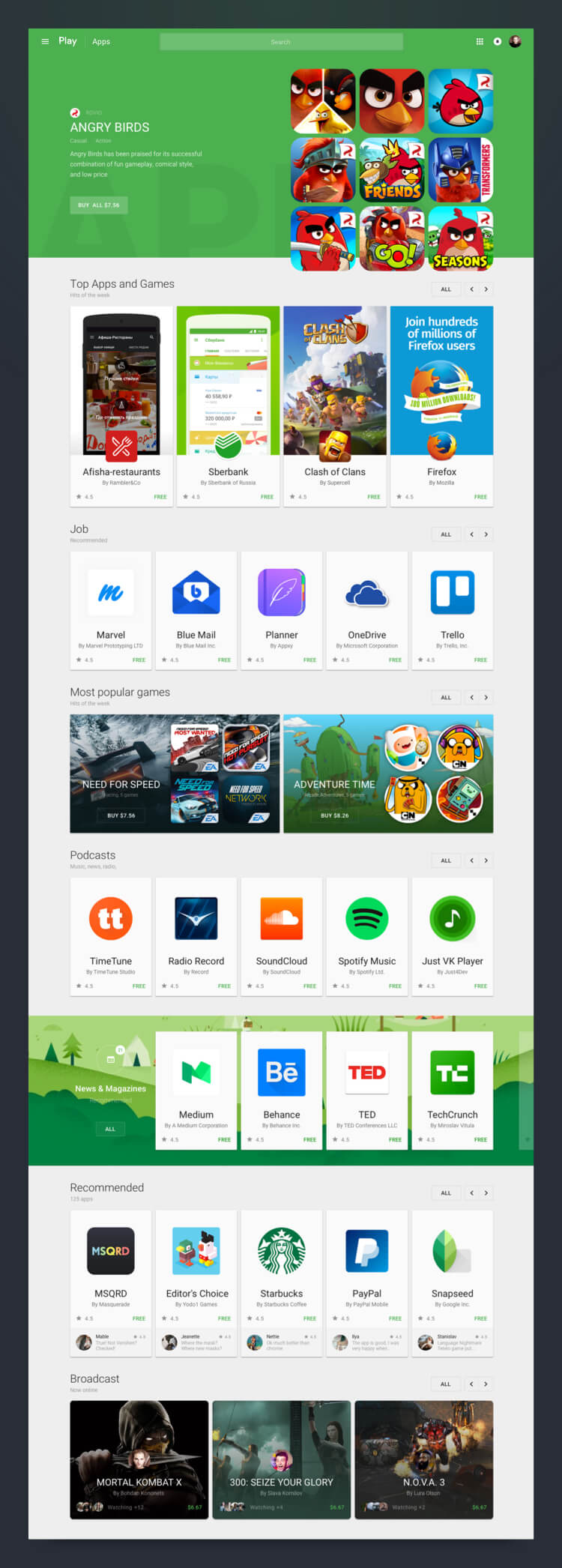 We came up with a redesigned page for games and apps that features a great deal of both paid and free games, plus podcasts and broadcasts available on the app. The layout ensures easy navigation as all games are well grouped to bolster accessibility.